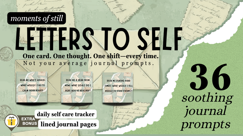 36 printable journaling prompts for reflective self-letter writing. Includes a self-care tracker and 4 softly designed lined pages to support mindful expression.
